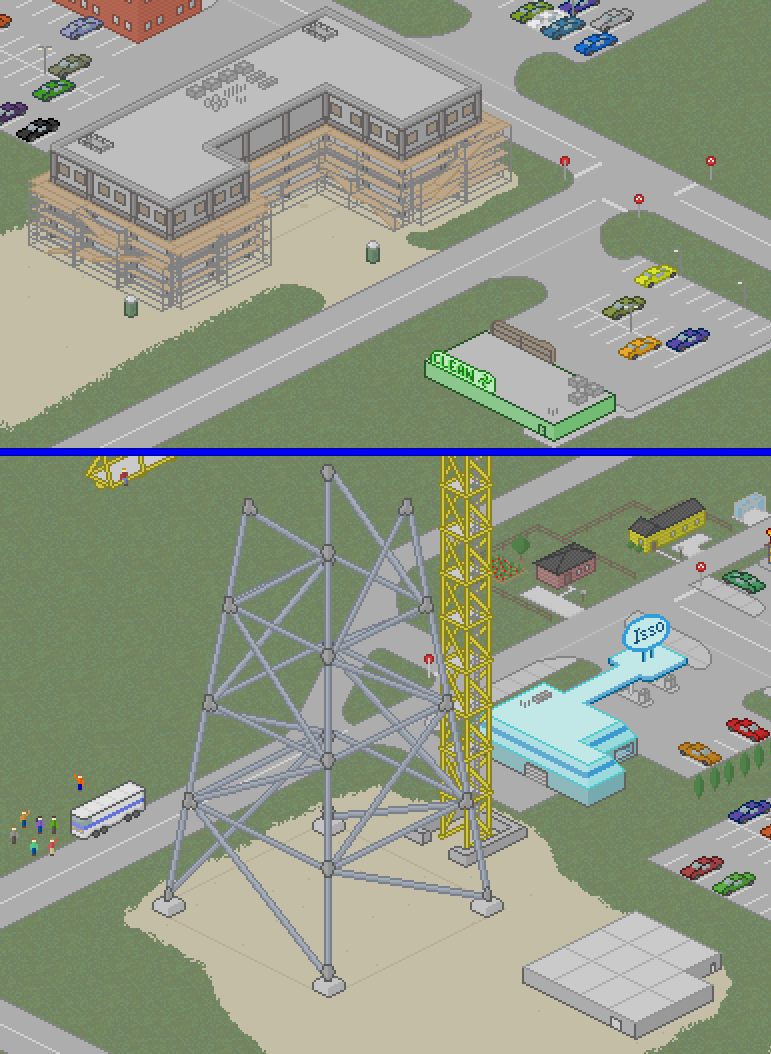 And what's this near the tower. A bus of tourists? Newcomers to Isotown. Ian has walked over to greet them. Who is that sitting on the crane though... The mysterious man from the blue jay incedent?